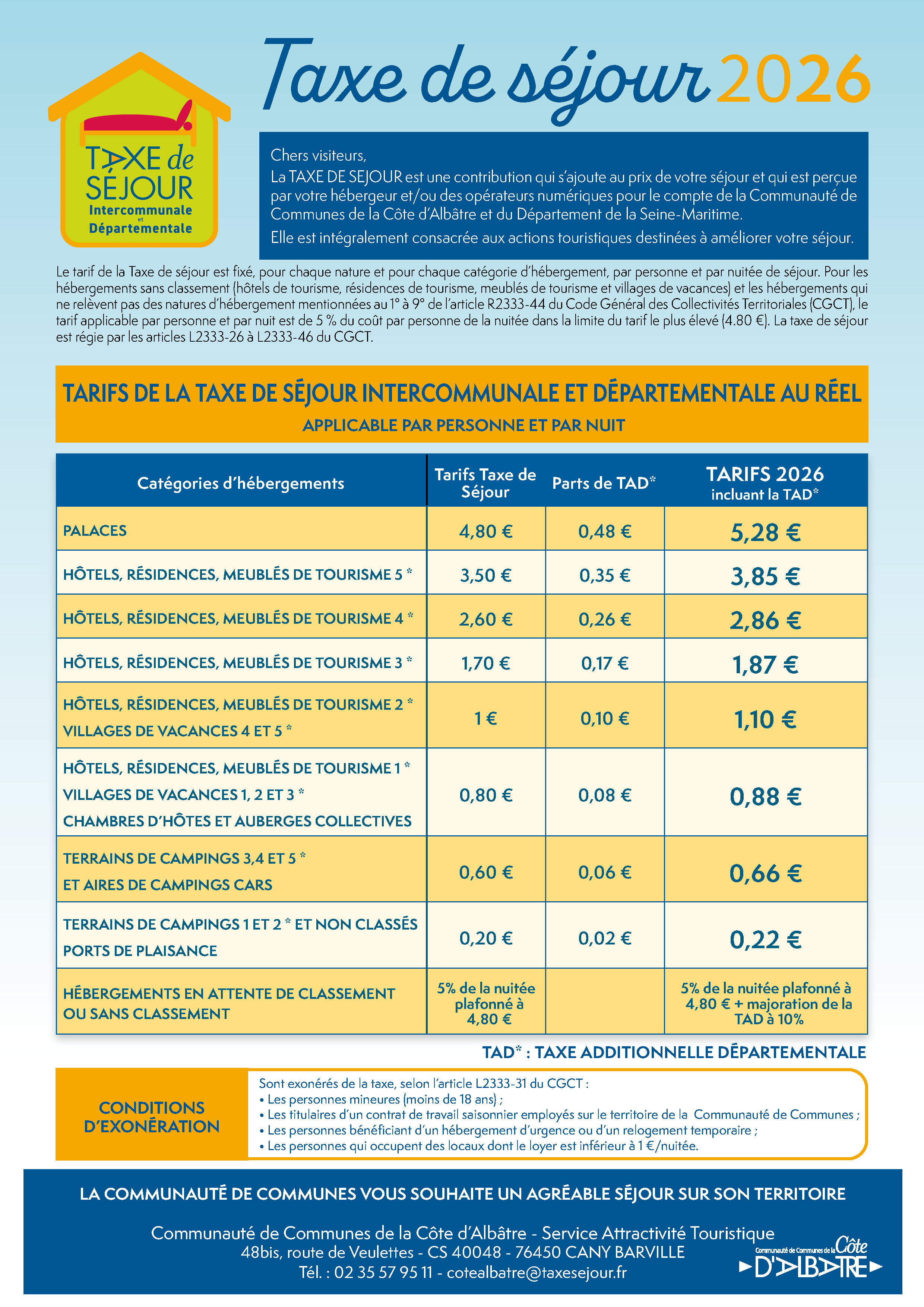 Les services de la Communauté de Communes de la Côte d'Albâtre restent à votre entière disposition pour vous informer et vous accompagner dans la collecte, la déclaration et le reversement de la taxe de séjour.